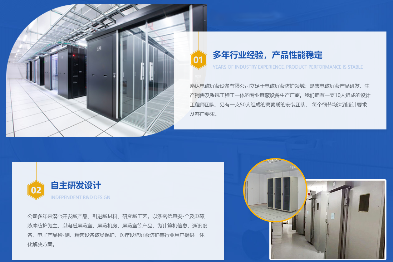 南陽(yáng)市泰達(dá)電磁屏蔽設(shè)備有限公司一家專(zhuān)業(yè)從事高性能電磁屏蔽室、屏蔽機(jī)房、屏蔽室、電磁屏蔽機(jī)房、屏蔽門(mén)等設(shè)備的開(kāi)發(fā)、生產(chǎn)、安裝的專(zhuān)業(yè)企業(yè)。目前我公司以擁有國(guó)內(nèi)較好的電磁兼容科研人員和高素質(zhì)的現(xiàn)場(chǎng)安裝力量,我公司有員工20余名包括技術(shù)、設(shè)計(jì)3名,我們的屏蔽機(jī)房已得到用戶(hù)好評(píng)。公司生產(chǎn)的屏蔽機(jī)房及屏蔽設(shè)備效能穩(wěn)定,使用方便,美觀(guān)大方,并能有效抑制工業(yè)和空間電磁場(chǎng)對(duì)室內(nèi)電子設(shè)備的干擾,防止機(jī)密電磁信息的泄露,它廣泛應(yīng)用于電子通訊、產(chǎn)品的生產(chǎn)調(diào)試、故障搶修、計(jì)量電磁、兼容測(cè)試,計(jì)算機(jī)、醫(yī)療設(shè)備、人防…